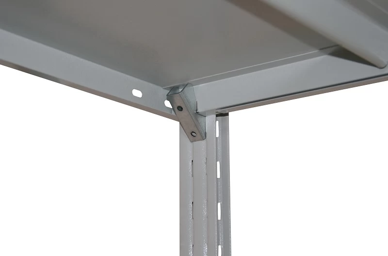 Металлические, усиленные полки стеллажа отличаются высокой надёжностью. Максимум распределённой нагрузки на одну полку – до 300 кг, на весь стеллаж – до 1800 кг.